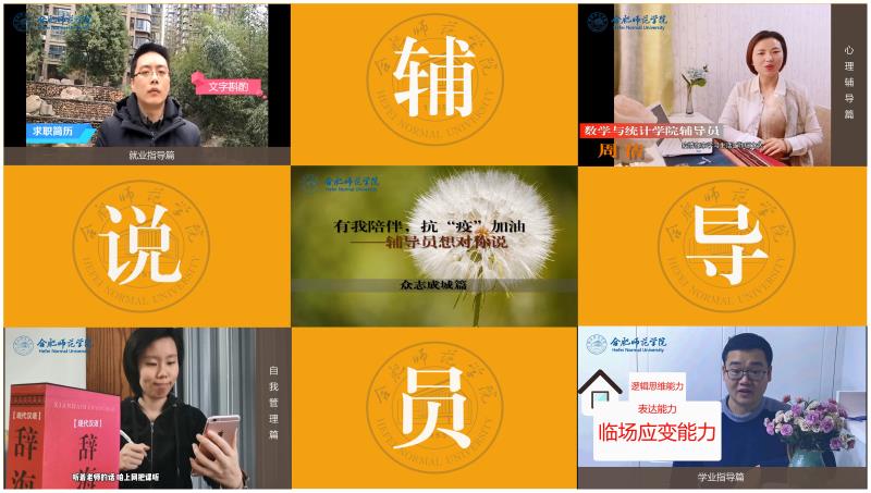 本网讯近日,在学生工作部的策划指导下,由辅导员协会会长、化学与化学工程学院张晖老师,辅导员协会副秘书长、刘铭传学院宗彪老师负责编导剪辑,党委学工部、辅导员16名老师组成团队策划拍摄了“有我陪伴,抗‘疫’加油——辅导员说”系列微视频,视频共分众志成城、心理辅导、学业指导、就业指导、自我管理五个专题,解读疫情防控中展示的中国力量、中国速度、中国精神,做好思想引导。系列视频通过“合肥师范学院官微”,“合师青年”微信公众号发布和班级微信群、QQ群推送,赢得了广大同学好评。