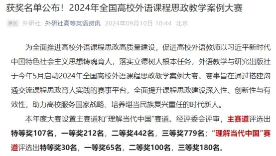 9月10日,2024年全国高校外语课程思政教学案例大赛获奖名单揭晓,外国语学院强云老师荣获全国一等奖。