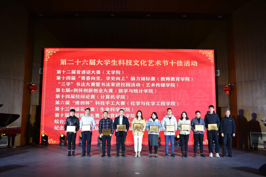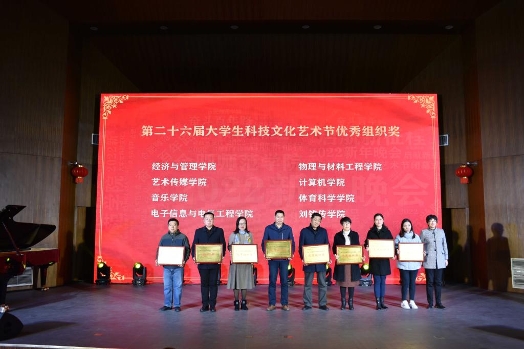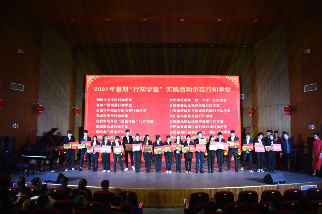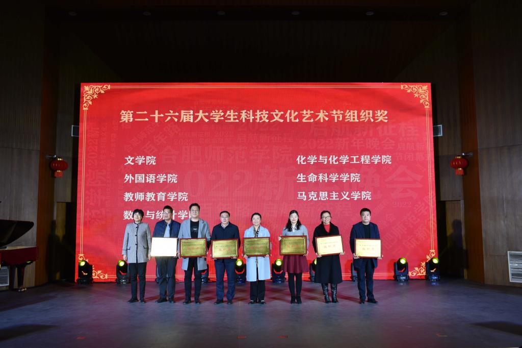 晚会现场,对2021年暑期“行知学堂”实践活动示范行知学堂,2021年“感动合师”十大青年学生,2021年“青年大学习”网上主题团课优秀组织奖,党史学习教育优秀青年学生宣讲员,第二十六届大学生科技文化艺术节优秀组织奖、组织奖、十佳活动等奖项进行了颁奖。