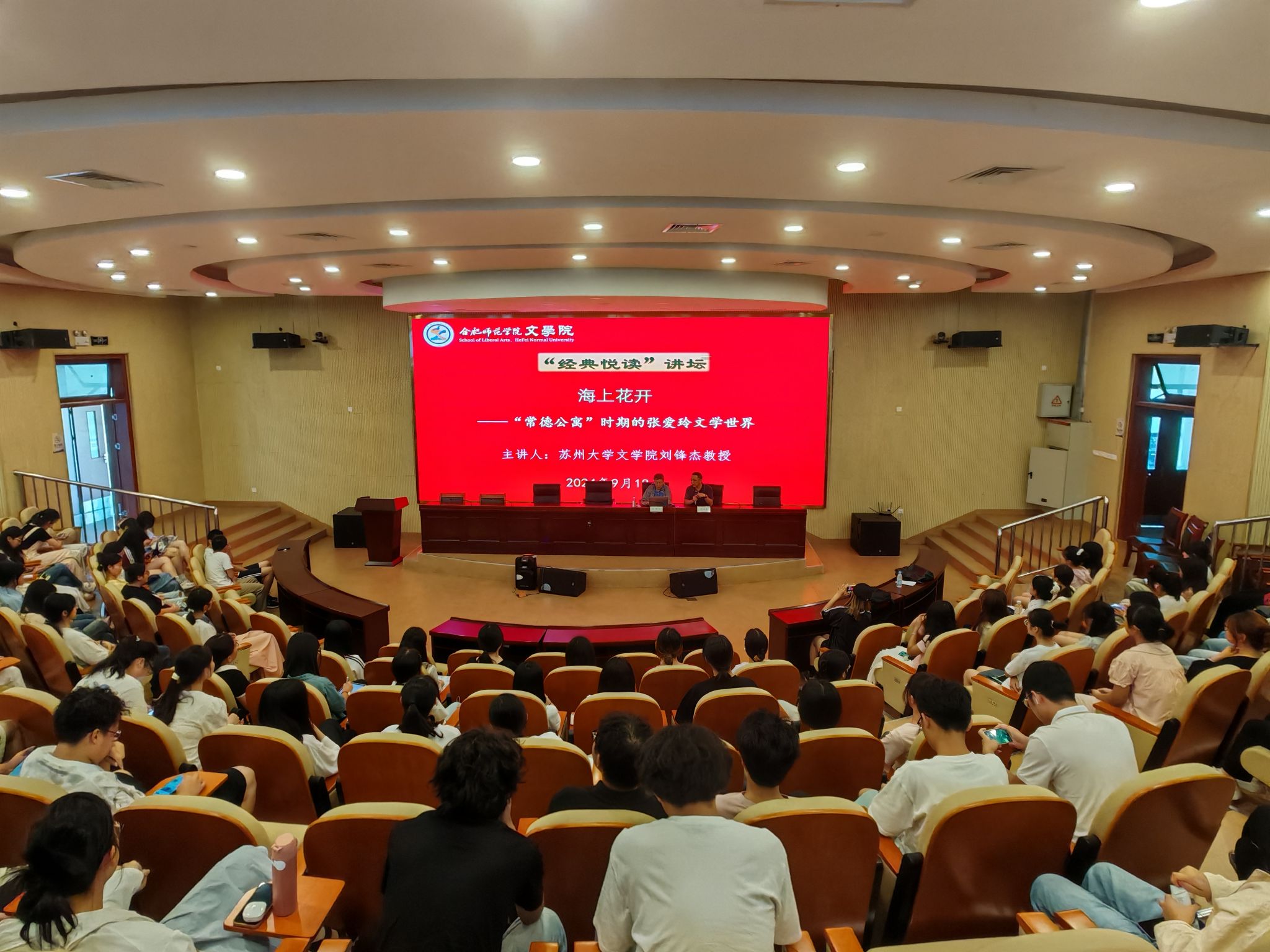 为浓厚学院学术氛围,倡导阅读启迪心灵,引领学生走进文学经典世界,合肥师范学院文学院筹划“经典悦读”讲坛系列学术报告,广邀名家学者为文学院学生开讲授课。9月18日下午,“经典悦读”讲坛首场报告在滨湖校区学术报告厅开讲,苏州大学刘锋杰教授应邀来校作题为《海上花开——“常德公寓”时期的张爱玲文学世界》学术报告。报告会由文学院院长何旺生主持。
