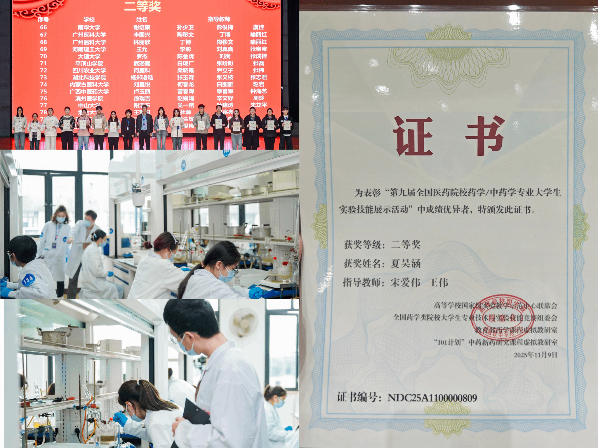 在全国性赛事中,23级生物制药班夏昊涵同学亮相于南京举办的“第九届全国医药院校药学/中药学专业大学生实验技能展示活动”。该赛事作为全国医药领域权威赛事,吸引了160多所高校900余名师生参与,竞争异常激烈。夏昊涵同学在理论考核与实验技能展示环节表现突出,最终斩获全国二等奖,实现了学校在该赛事参与奖项的双重突破。