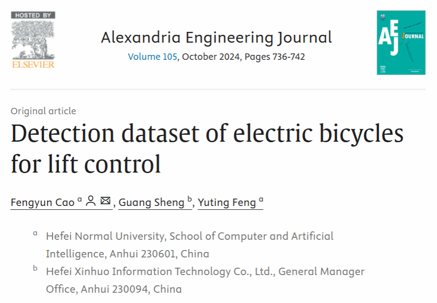 近期,相关成果以“Detection dataset of electric bicycles for lift control”为题被期刊Alexandria Engineering Journal发表(论文引用格式:Fengyun Cao, Guang Sheng, Yuting Feng, Detection dataset of electric bicycles for lift control [J], Alexandria Engineering Journal, Volume 105, 2024, Pages 736-742. )。该期刊为中国科学院二区TOP期刊,影响因子为5.9。合肥师范学院为该论文的第一单位,计算机与人工智能学院曹风云老师为第一作者、通讯作者。