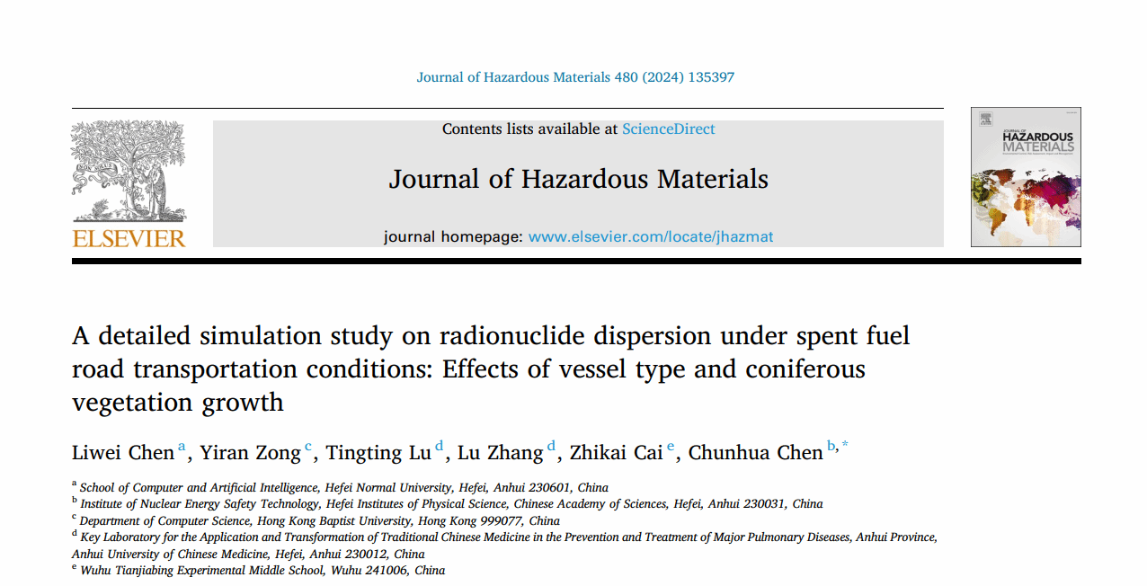 近期,相关成果以“A detailed simulation study on radionuclide dispersion under spent fuel road transportation conditions: Effects of vessel type and coniferous vegetation growth”为题发表在《Journal of Hazardous Materials》期刊。该期刊为中国科学院一区TOP期刊,影响因子为12.2。合肥师范学院为该论文的第一单位,安徽省智能安检技术工程研究中心、计算机与人工智能学院陈黎伟老师为第一作者。