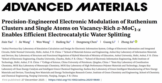 近日,电子信息与集成电路学院青年教师姚吉鑫及其合作团队在精密工程化电子调控核心技术方面取得突破性研究进展,相关研究成果以“Precision-Engineered Electronic Modulation of Ruthenium Clusters and Single Atoms on Vacancy-Rich α-MoC1-x Enables Efficient Electrocatalytic Water Splitting”为题,发表于材料科学顶级期刊《Advanced Materials》(自然指数期刊,中国科学院大类一区Top期刊,IF=26.8)。电子信息与集成电路学院姚吉鑫博士为第一作者,合肥师范学院为第一署名单位。