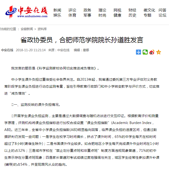 本网讯 11月15日,安徽省政协“着力解决中小学生课外负担重问题”月度专题协商会上,省政协委员、我院院长孙道胜以《科学监测家校协同切实推进减负增效》为题对监测反映的课外负担情况进行通报,提出了探索完善制度设计,引导规范办学行为;深化改革教学模式,提升课堂教学效果;加强家校协同合作,倡导理性家庭教育;完善课业监测体系,构建常态预警机制等四个方面的对策和建议。11月20日,中安在线对此进行了报道。