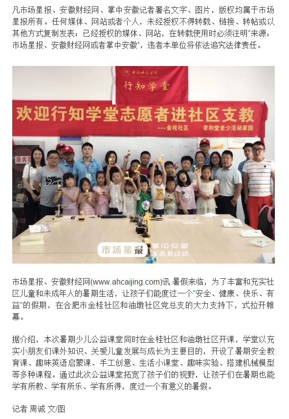 本网讯 7月17日,市场星报、安徽财经网对我院物理与材料工程学院金桂社区“励学行知学堂”进行了报道。(物理与材料工程学院)