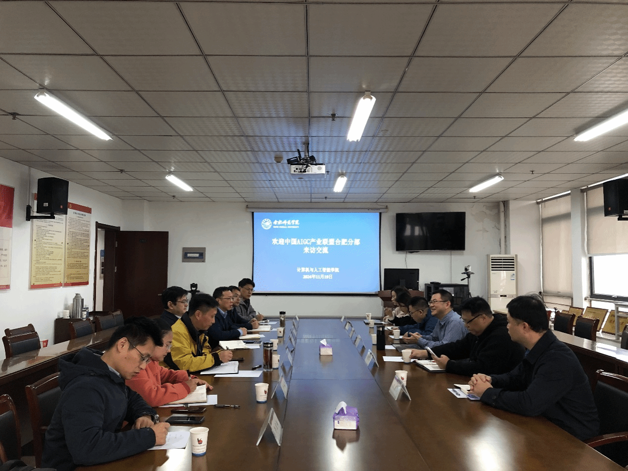 11月19日上午,中国AIGC产业联盟合肥发起人、安徽数字产业科技公司、安徽力瀚科技联合创始人陈小奇一行来我院开展校企合作交流,教务处处长钱立青、文学院院长何旺生、计算机与人工智能学院院长谢飞、美术与设计学院副院长吴道义和相关专业骨干教师在计算机与人工智能学院1302会议室参加了交流会。